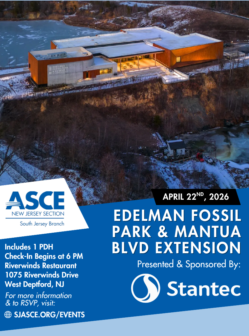 Join SJASCE on Wednesday, April 22nd, 2026, for an evening dedicated to the engineering and development of the Mantua Blvd Extension (CR 676) roadway to the new Edelman Fossil Park & Museum of Rowan University. This featured project, presented and sponsored by Stantec along with Earth Engineering Inc., represents a unique integration of world-class cultural design and essential infrastructure.